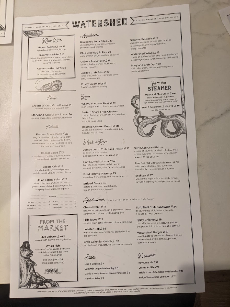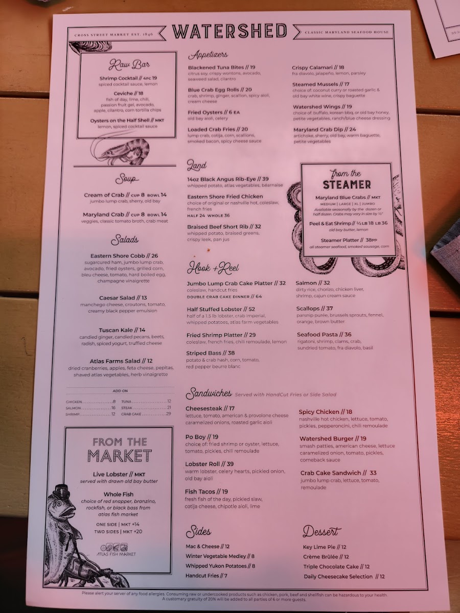 Watershed invites guests to indulge in memorable dishes, including the uniquely crafted Watershed Wings, drizzled in a transformative Old Bay Honey sauce—a true game-changer. Customers rave about the friendly service, exemplified by staff like Damien, who expertly guided a first-time crab eater through the delightful process of enjoying crabs.